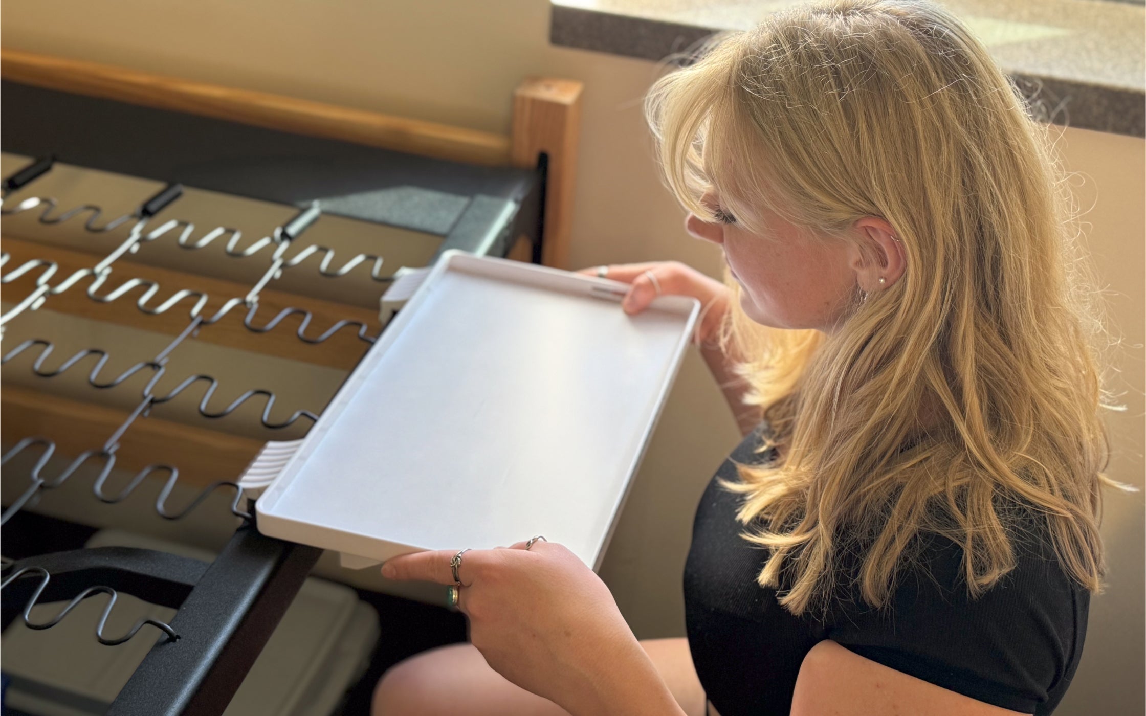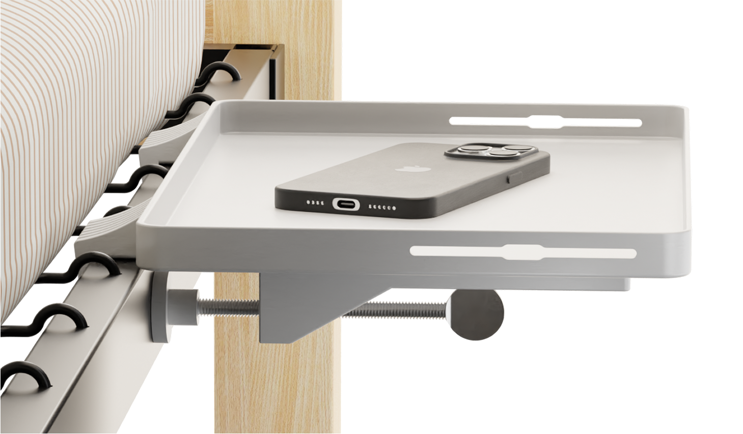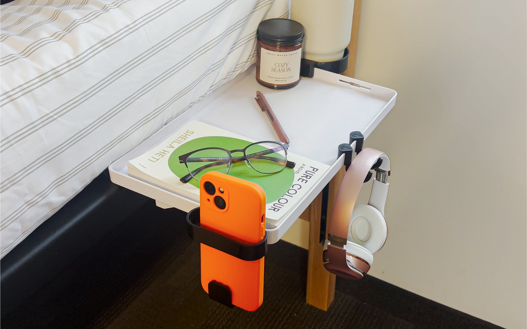 The BedShelfie installs in seconds—no screws, no drilling, and no damage to your bed frame. Just clamp it on and you’re done.
